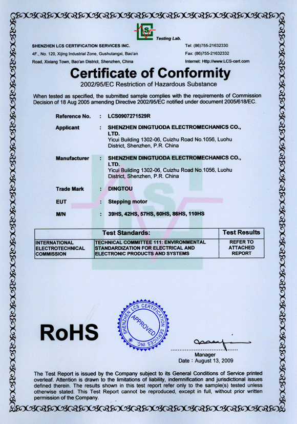 首頁->產品認證->步進電機RoHS認證證書